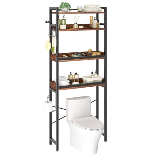 - 🚽Utility Design: Our over the toilet storage shelf features 4 open shelves, along with 4 removable hooks and a toilet paper holder, providing ample storage space. The compartment below the wooden shelf helps organize your toilet, washing machine, dirty clothes cart, and other large items.