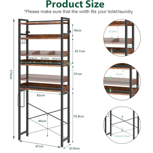 - 🚽Adjustable Shelves: Overallsize: W67xD24xH173cm. Featuring two adjustable wooden shelves, you can customize the distance between shelves to accommodate items of various heights, maximizing storage capability. Height-Adjustable Layers 3 & 4 (up by about 6 or 12cm). Bottom Clearance Range: about 78.9cm–84.9cm-90cm fits most toilets and even washing machines. Adjustable X-shaped Metal Frame: avoid block the toilet hose tube.