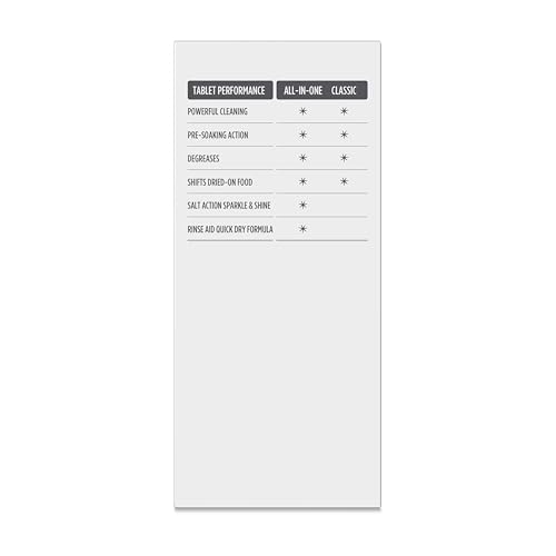 - DISHWASHER TABLETS – All-In-One: Powerful Cleaning, Pre-Soaking Action, Degreases, Shifts Dried-On Food, Salt Action Sparkle & Shine, Rinse aid quick dry formula: Powerful Cleaning, Pre-Soaking Action, Degreases, Shifts Dried-On Food.