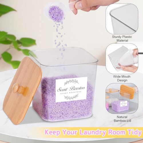 This laundry scent booster container set includes clear containers with wooden lids x3,dryer sheet holder x 1, scoops x3, labels x16. Store laundry detergent organizer, laundry powder, dryer balls, stain remover, and clothes pins with ease