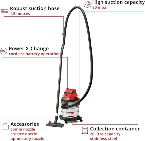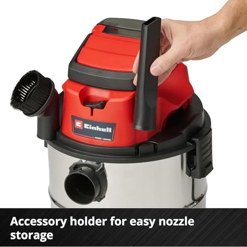 Einhell Cordless Wet and Dry Vacuum Cleaner 18V Power X-Change, 20L Heavy-Duty Stainless Steel Tank, 1.5M Hose, Blow Function Without Battery TE-VC 18 Li Solo
