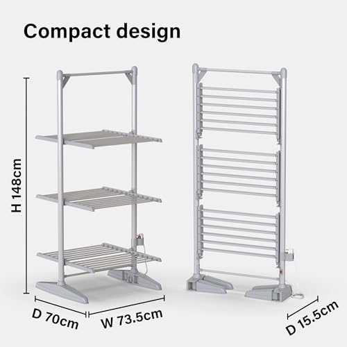 - FOLDABLE DESIGN: The fantastic design of this heated clothes airer allows it to fold flat for easy storage. The heated clothes airer can also fold just the shelves you need, so you can customise your rack by folding up the shelves you do not need.