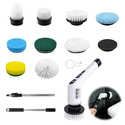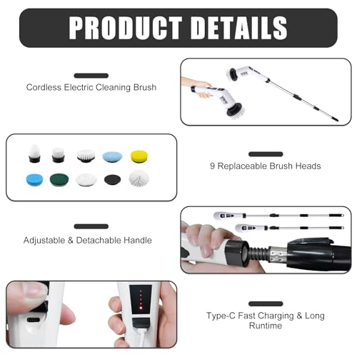 • Electric Scrubber – Adjustable Handle and Practical Design: This electric scrubber features an extendable handle that allows comfortable use on floors, walls, and elevated surfaces. The lightweight structure supports upright cleaning, reducing the need for bending or kneeling during extensive cleaning sessions around the house.