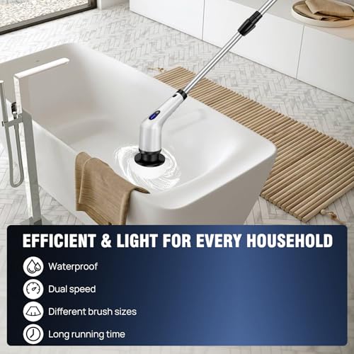 - Telescopic Handle: Electric spin scrubber allow you to adjust the length from 100cm up to 126cm, lets you say good by to heavy lifting labor and no more bending or kneeling to clean.
