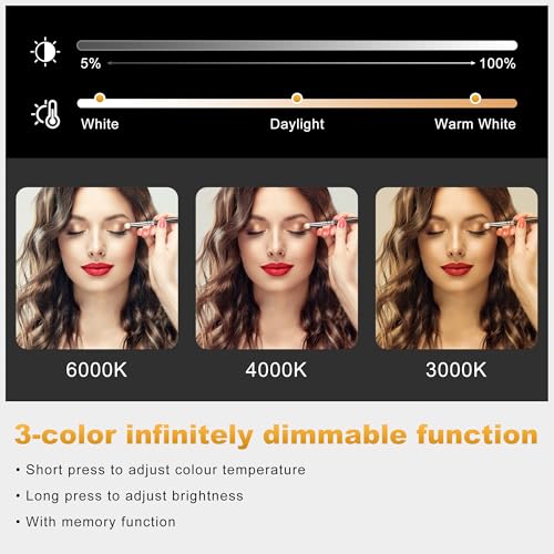 • 【3 Colors Dimmable & Memory Function】This LED bathroom mirror features three lighting modes. A short press of the middle button selects white light (6000K), natural light (4000K), or warm light (3000K). A long press of the last button adjusts the brightness from 10% to 100%. With the power-off memory function, the last light setting is retained.