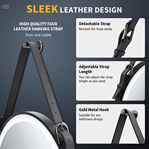 ELEGANT Modern Round LED Bathroom Mirror Wall Mounted with Lights Black Frame Leather Strap Illuminated Vanity Mirror with Sensor Touch Control, Anti-fog, Dimmable 3 Color Lighting 600 x 600mm