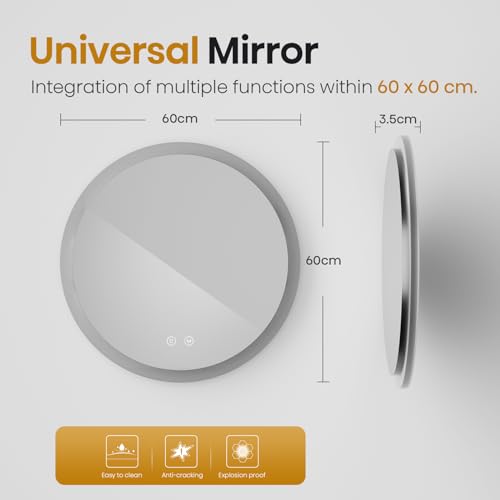 EMKE® 4 in 1 Round Bathroom Mirror with LED Lights 60cm with 3000K/4000K/6500K Touch+Dimmable+Demister Pad IP44 Energy saving Illuminated Backlit Wall Mounted Vanity Mirror Round