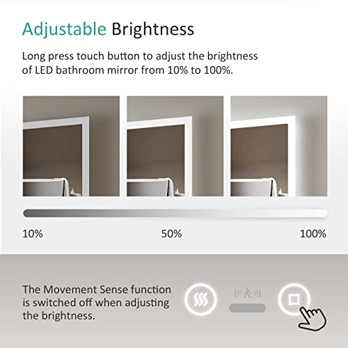 - 【Adjusting Brightness】- Adjust the light levels in a mirror by long press on touch switch. Additionally, make it easy for you to adjust the ambiance of a bathroom to your preference at any time of the day or night.
