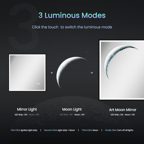 • 【Moon-Inspired Design】This bathroom mirror with LED lights features a unique moon-inspired design, adding a touch of art to your space. With 3 luminous modes and adjustable brightness (10%-100%), this LED bathroom mirror creates the perfect ambiance for any occasion.