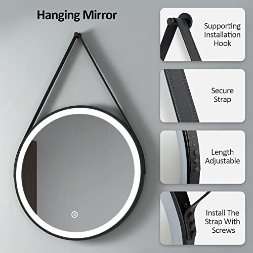 EMKE Round Led Mirror with Leather Hanging Strap, Large Round Mirror with Lights Black Frame Illuminated Circular Bathroom Mirror with Touch Switch, Brightness Adjustable 500 x 500mm