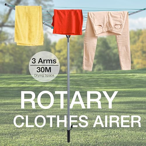 EPISENT 3-Arm 30M Rotary Washing Line – Heavy Duty Outdoor Clothes Airer with Ground Spike | Adjustable Height, Non-Slip Lining, Foldable Whirligig Dryer Umbrella System for Garden & Patio Use