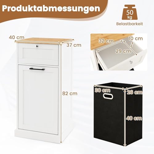 FANTASK Laundry Cabinet with Fold-Out Basket & Drawer – Bathroom Storage with Bamboo Top for Laundry Hamper, 40 x 37 x 82 cm, White