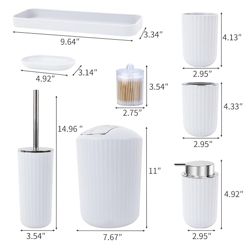 FEILANDUO Bathroom Accessories Sets Complete, 8 Pcs Bathroom Accessory Set with Trash Can, Soap Dispenser, Soap Dish, Toothbrush Holder, Toothbrush Cup, Toilet Brush and Qtip Holders,Vanity Tray White