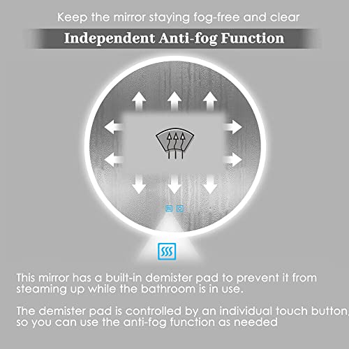- Fog-free: This round led bathroom mirror is equipped with a demister pad at the back. The demister is controlled by an independent touch button; when activated, it warms up the bathroom led mirror to prevent it from becoming steamed up, leaving you with a clear view after every bath or shower