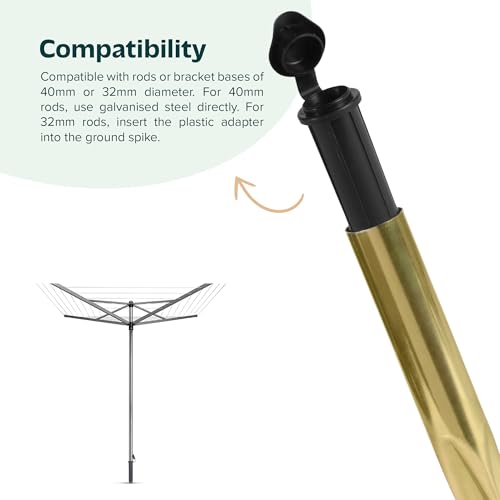 • DEPENDABLE : Rotary washing line spike can be used on any bracket, rod, base with a diameter of 40 mm or 32 mm. You can use galvanized steel directly, If the diameter of your rod is 40 mm,. If your rod is 32 mm, you can insert the plastic adapter into the ground spike