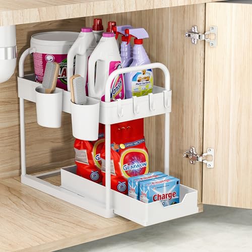 - Save Space&Neatly Organized: Gemwon under sink storage maximizes space-saving, the double-layer design helps you store more items in the same space. The storage organiser could hold dish-washing liquid, shampoo, shower gel, cosmetics, etc. Making bottles and jars more orderly under the sink