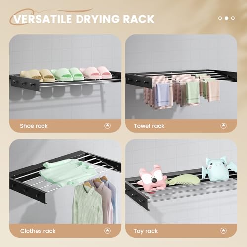 - Multifunctional Clothes Drying Rack: Our wall mounted drying rack consists of 5 aluminum rods, provides ample space (100×58cm/39.4×22.8in) for clothes storage, clothes drying and hanging and ensures ventilation airflow at the same time. It can also be used as a shoe rack, towel rack, or a toy rack.