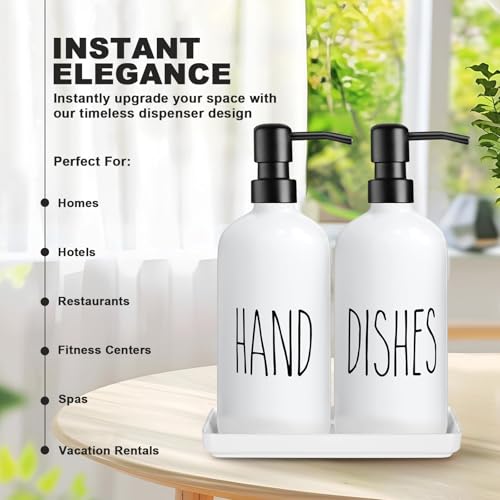 - Kitchen Transformation: Elevate your kitchen's aesthetic appeal with this Glass Soap Dispenser Set, comprising two 16oz dish soap dispensers and a coordinating ceramic tray. This ensemble caters to a variety of everyday needs, instantly refreshing your space with a touch of elegance and organisation.