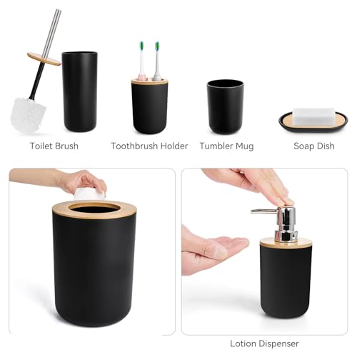GREENSAPPIRE Bathroom Accessories Set – 6-piece Modern Bathroom Bin And Toilet Brush Set – Includes Trash Can Toilet Brush Toothbrush Holder Soap Dispenser Soap Dish and Mouthwash Cup (Black)