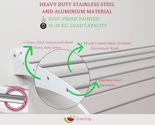 GreenUp Wall-Mounted Fold-Up Laundry Drying Rack – Space-Saving 5.7 Meters, Heavy-Duty Design for Indoor Outdoor Use (White, 95 CM.)