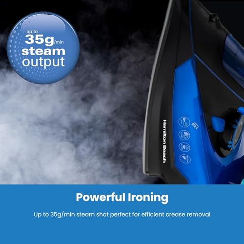 Hamilton Beach Steam Iron, 3000W, SteamMax Pro, Non-Stick Ceramic Soleplate, Dry or Steam Ironing, Spritz Function, Crease Removal, Vertical Steam, Easy Fill Tank, Self Cleaning, Black/Blue – HB608BB