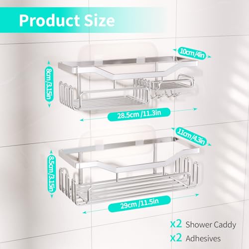 The 2 shower baskets are designed with soap dish holder, razor holder and 9 hooks, let shampoo, conditioner, soap, bath sponge, razor & body wash conveniently stored in one area, gives a very clean and neat appearance to your shower