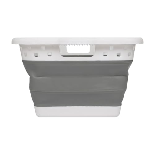 Harbour Housewares 42L Collapsible Laundry Basket – White/Grey – 1x Large Plastic Foldable Folding Pop Up Space Saving Washing Storage Clothes Container Organiser Hamper Bin with Handles