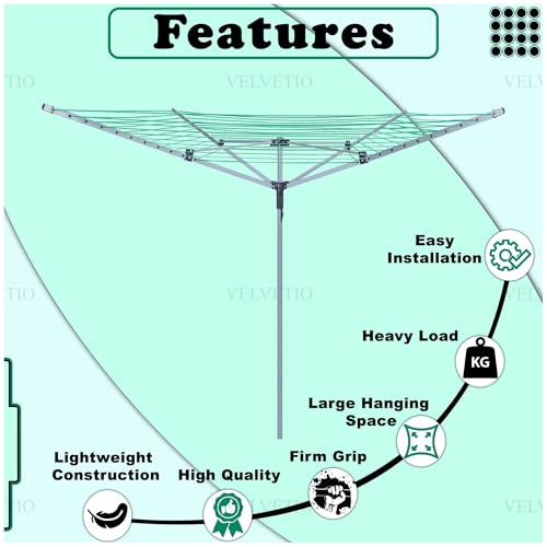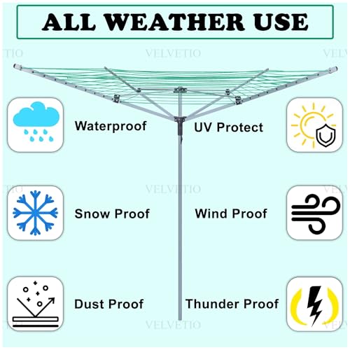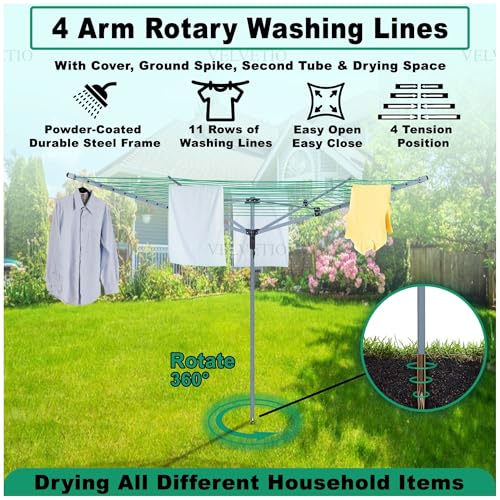 - 【4 Arm – 45M Rotary Airer】Our robust rotary washing line features a resilient, weather-resistant powder-coated frame and 45 metres of PVC-coated drying line, ideal for larger households. Comes with a protective cover and ground spike.