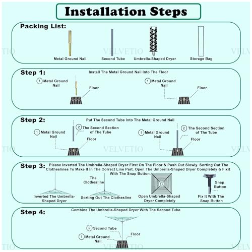 - 【Effortless Installation and Assembly】Securely embed the included metal ground nail (15 inches) and spike (33 inches) into the earth to provide a stable and secure base for the airer, ensuring it remains steady in strong winds and all weather conditions.