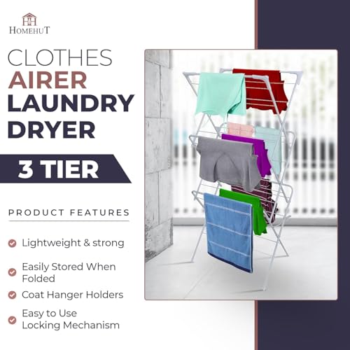 - Easy to Use – Simply set up the HH Home Hut Clothes airer horse Folding 3 tier on a flat and even surface, ensure the locking mechanism is in place, and start hanging your washing. It's a perfect indoor solution for drying clothes, offering a generous drying area and a sturdy structure. Ideal for all types of clothes, it is a must-have in every laundry room.