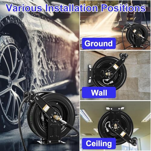 - Wide Applications: With its adjustable guide arm and large steel base, this pressure hose reel offers versatile mounting options. Securely install it on various flat surfaces such as floors, walls, ceilings, or in garages, body shops, and workshops—indoors or outdoors. For safety, ensure the hose reel is securely fixed and all connections are tight before use.