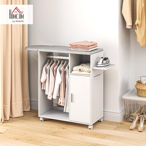 HOMCOM Rolling Ironing Board Cabinet, Foldable Ironing Station with Storage, Wheels, Open Compartment, Clothes Rail and Iron Holder for Home, Laundry Room, White