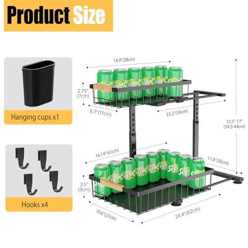 - 【With 2 Sliding Baskets】The top and bottom storage baskets of the sink cabinet organizer can be pulled out by handles, so you no longer need to bury your whole body in the cabinet. Equipped with 2 hanging baskets and 8 detachable hooks for hanging small items, it can effectively utilize the entire cabinet space.
