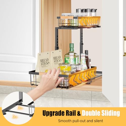 - 【Unique sliding design】 Adopts a unique circular guide rail design, which is easier to pull out than the old undersink kitchen organiser on the market. It glides smoothly and quietly without getting stuck. Rail catches prevent them from pulling out completely or tipping over. The bottom of the cupboard organiser is equipped with 4 suction cups to keep the kitchen storage stable during the pulling process and not easy to slip.
