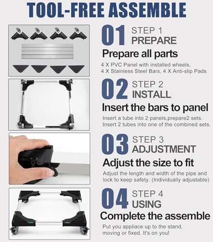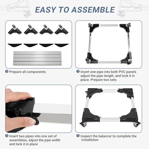 - Easy Installation: Simply connect the metal tube and the base, then screw on the rollers, adjust the size, the stand for tumble dryer installation process can be completed within 5 minutes. Easy to carry devices that are too heavy to clean the floor in time or move to another place for use.