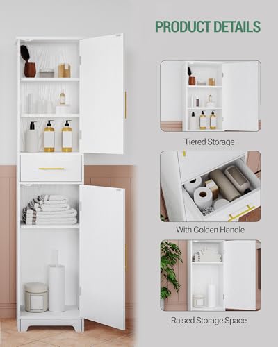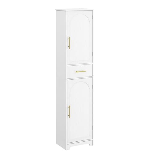 Hzuaneri Tall Bathroom Cabinet, Slim Storage Cabinet with1 Drawer and 2 Doors, Tall Narrow Cupboard with Adjustable Shelf, for Bathroom, Living Room, Bedroom, Kitchen, Hallway, White, SC18303X