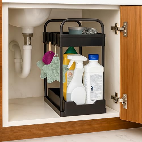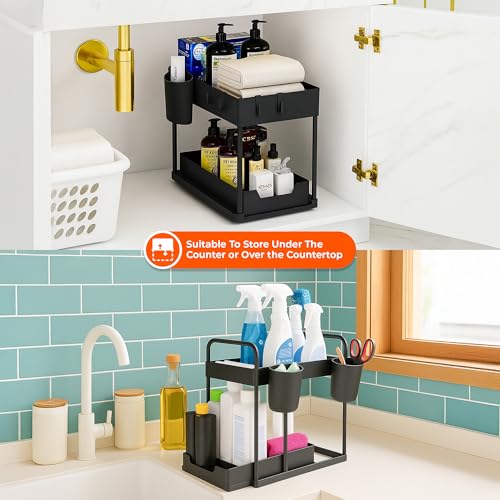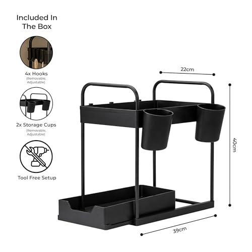 Innoteck Under Sink Organiser 2-Tier Storage Rack with 4 Hooks & 2 Cups, Slide-Out Basket Design for Kitchen or Bathroom, Matte Black Under-Sink Shelf – H40 × L39 × D30cm