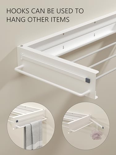 JOOM Laundry Drying Rack Collapsible, Wall Mounted Drying Rack, Clothes Drying Rack, 31.5" Wide, 5 Aluminum Rods, 60 lb Capacity (White 31.5" with Hooks)