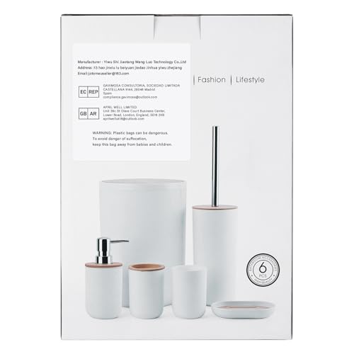 - 【The 6 Pieces Perfect Bathroom Set with GIFT 】: This set contains seven pieces -1 plastic cup, 1 toothbrush holder, 1 lotion dispenser,1 soap dish, 1 medium trash can and 1 toilet brush. One set meets multiple needs.
