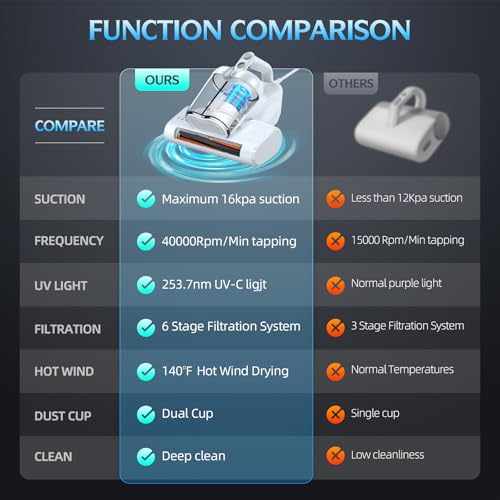 - 【Unbeatable Cleaning Efficiency】Equipped with a robust 600W motor, powerful 16Kpa suction and upgraded 40,000Rpm/Min brusholl rotation and 60℃ of heated air generates by the motor, Ultra-UVC-K16 Mattress vacuum ensures a thorough removal of dust, dander and particles, keeping your mattress/bed fresh