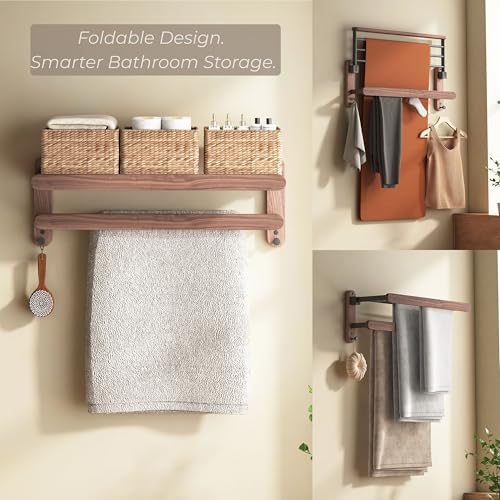 Jugen Towel Rail Wall Mounted – Foldable 2-Tier Bathroom Towel Rack with Hooks, Solid Black Walnut Wooden Towel Holder, No Drill Self Adhesive or Screw Mount, 60cm