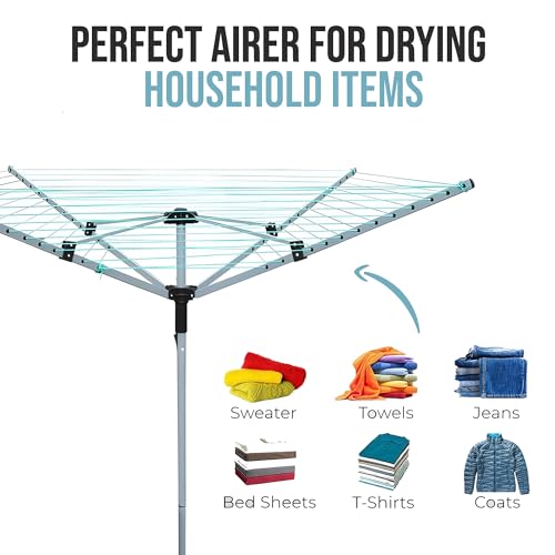 - 🌀 Maximum Airflow Drying Power: Engineered to deliver superior drying results, this 4 arm rotary washing line maximises airflow for fast and efficient drying. A perfect outdoor rotary washing line for gardens or patios, it provides a sturdy and energy-saving solution for all your clothes drying needs.