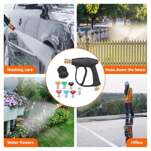 - 💦【Widely Used】With a maximum pressure rating of 4350 PSI, the professional short jet wash gun that effectively removes dirt, grime, and other tough stains from various surfaces, including concrete, wood, tile, brick, and metal, driveways, patios, and siding. High pressure washer gun's versatility and ease of use make it a must-have tool for tackling a range of cleaning tasks