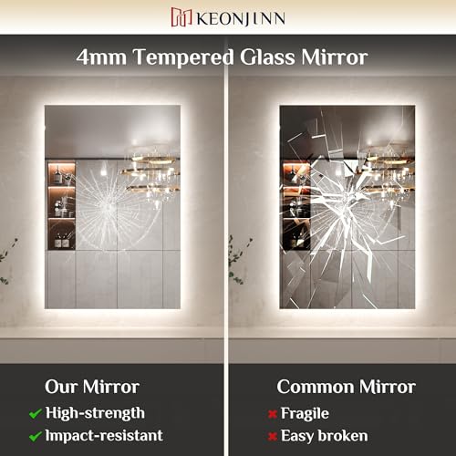 Keonjinn Led Lights Bathroom Mirror 50×70, Illuminated Light Up Rectangle Bathroom Mirror with Backlit Light, Anti-Fog Wall Mounted Vanity Mirrors 3 Colors Dimmable, Memory Function, IP44 Waterproof