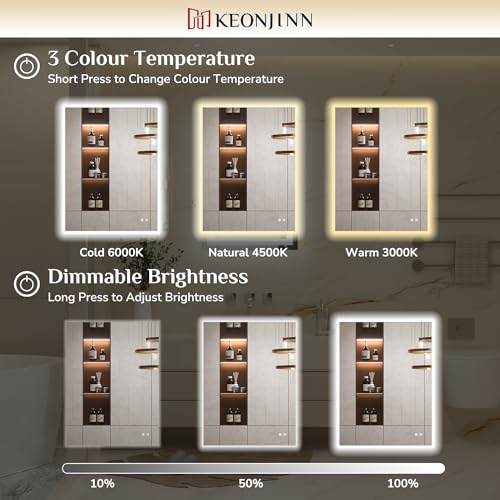 - 【Illuminated Bathroom Mirror】Light up bathroom mirror can Personalize your lighting with a tap. Press and hold to adjust the brightness, or tap to cycle through three color temperatures (warm 3000K, natural 4500K, cool light 6500K). Your perfect setting is remembered for next time, making every use effortlessly convenient. Note: The button glows softly when the mirror is off. Long-press to turn off the light.