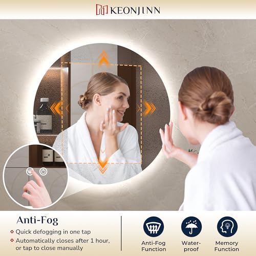 Keonjinn Round Bathroom Mirror with LED Lights, 50cm Illuminated Light Up Bathroom Mirror with Backlit Light, Anti-Fog Wall Mounted Vanity Mirrors 3 Colors Dimmable, Memory Function