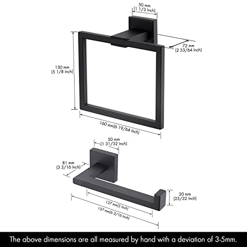 • Dimensions: Towel Ring – The overall dimension: 6.29" x 5.12" x 2.83" (160 x 130 x 72mm) (L x W x D). Toilet Paper Holder – The overall length of the toilet-roll holder is 6.19" (157mm), and the usable length is 5" (127mm). The projection is 3.19" (81mm).