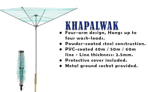 KHAPALWAK 50m Rotary Washing Line, Foldbale 4 Arm Heavy Duty Outdoor Umbrella Rotary Dryer With Metal Ground Spike & Wheatherproof Cover (Silver & Grey)