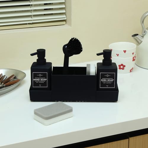 Kitchen Soap Dispenser Set, Washing Up Liquid Dispenser Black with Sponge Caddy and Brush Holder, Dish Soap Dispenser for Kitchen Countertop Sink Organiser (Black, 4 in 1)