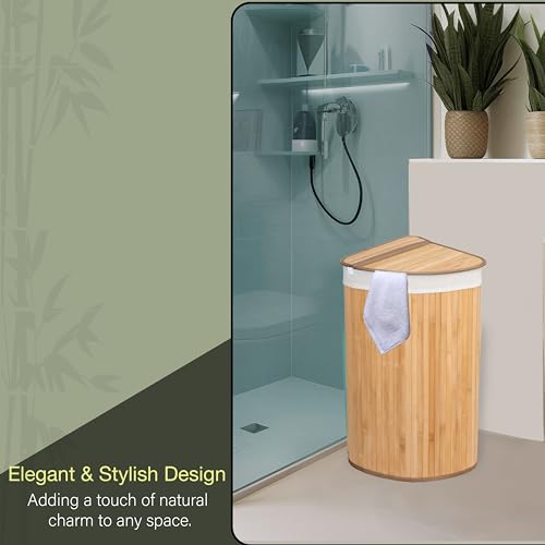 KNIGHT 57L Bamboo Laundry Hamper, Corner Laundry Basket with Swing Lid, Removable & Washable Lining, Easy to Assemble & Foldable Storage Bin,35x35x60 (Natural)